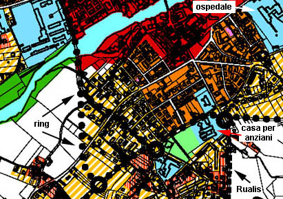 In corrispondenza del ponte nuovo si prevede una rettifica della strada che da Rualis porta verso la stazione ferroviaria con la costruzione di un triangolo viario fra la villa Sirica e il lato occidentale della villa Muzzolini. In questa area si prevede una completa urbanizzazione con delle aree di completamento che determineranno un notevole espansione edilizia con conseguenti immaginabili problemi di traffico, smog, rumori, ecc. in una zona che già oggi è investita da un notevole volume di traffico per di più in vicinanza di scuole e in corrispondenza di un incrocio, quello verso il ponte nuovo, attualmente molto pericoloso.