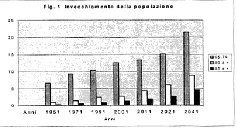 Tab. 3 - La popolazione italiana per grandi classi d'età: 1951 - 2041 Anni Totale 0-19 20-59 60 e + 80 e + 85 e + 1951 47.516 16.462 25280 5.774 510 160 1961 50.623 16.182 27.395 7.046 724 239 1971 54.137 17.077 28.048 9.012 996 349 1981 56.557 16.816 29.890 9.851 1.247 445 1991 56.778 13308 31.481 11.989 1.954 726 2001 57.884 11.349 32.457 14.038 2.389 1.253 2011 58.588 11.051 31.590 15.944 3.607 1.701 2021 58.034 10.230 30.016 17.786 4.562 2.362 2041 55.044 8.597 24.223 22.222 6.311 3.557 Per quanto riguarda il primo ventennio (1951-1971) il segmento più anziano (85 e più) è cresciuto ad un tasso doppio del gruppo più giovane (65-79 anni), e nell'intervallo che arriva fino ai giorni nostri, tali differenze sono ancor più accentuate: gli appartenenti alla fascia d'età più anziana si sono accresciuti ad un tasso 3 volte più grande che quello corrispondente alla classe 65-79 anni.